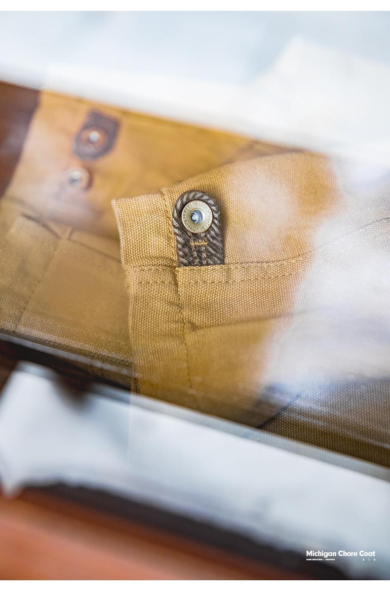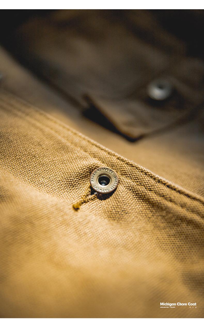 2. Aus 100 % Baumwolle, mit einem Gewicht von 440 g/m², schwerem Canvas, mehrfädigem, dickem Garngewebe, dichter und dicker Textur, steifem Griff, abriebfest und langlebig, was der Jacke einen zeitlosen Arbeitskleidungs-Charme verleiht.