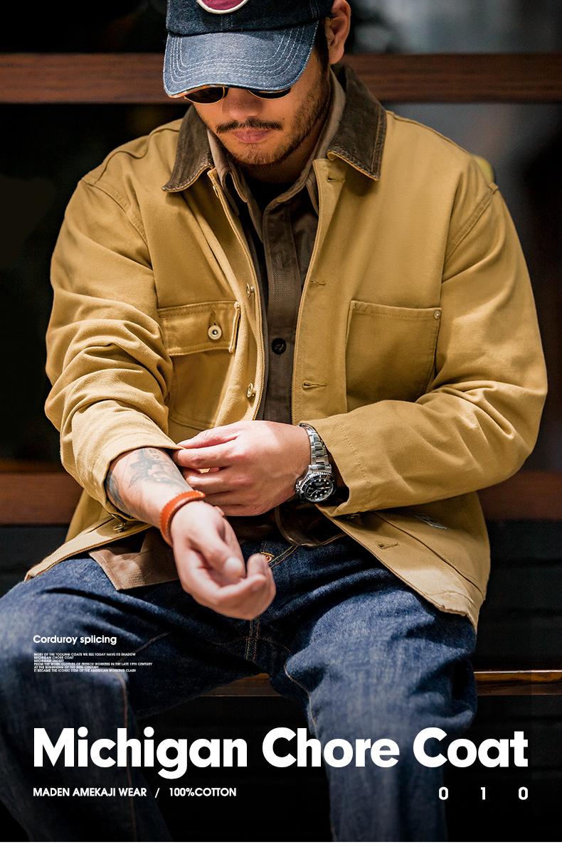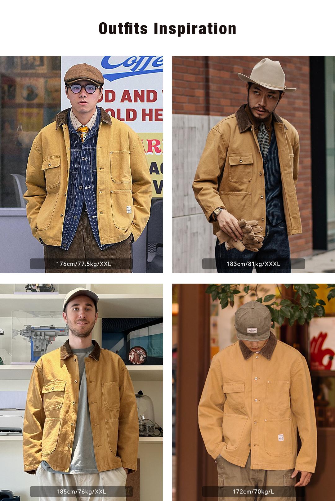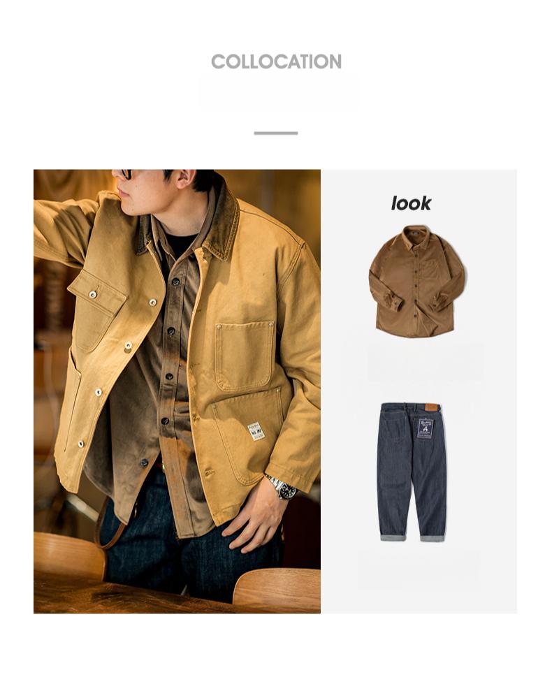 1. Klassisches Revers, gerader Schnitt, 5-Knopf-Leiste und 4 charakteristische aufgesetzte Taschen – ein Retro-Arbeitskleidungsstil mit robustem amerikanischem Flair.