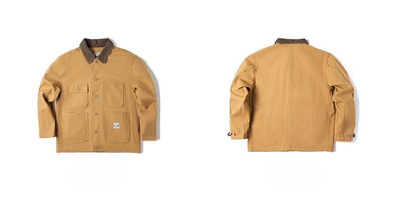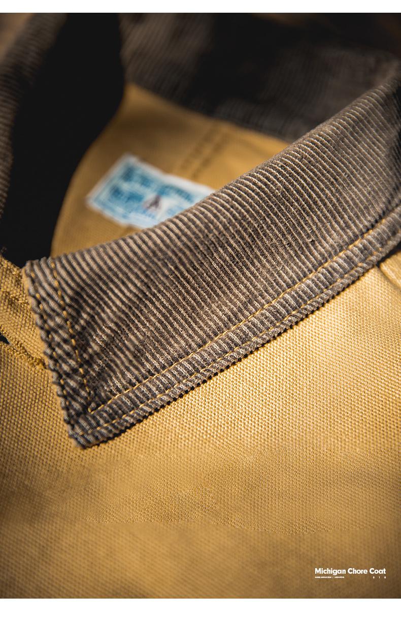 3. Cordbesatz am Kragen und Canvas-Körper; beide Stoffe besitzen Retro- und strapazierfähige Eigenschaften und ergeben zusammen ein Vintage-Arbeitskleidungsgefühl.