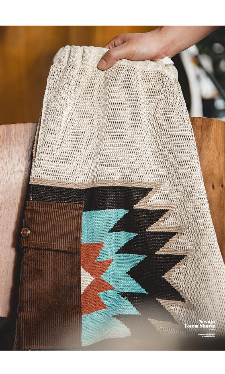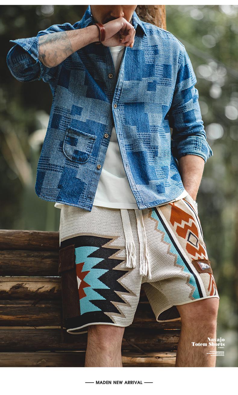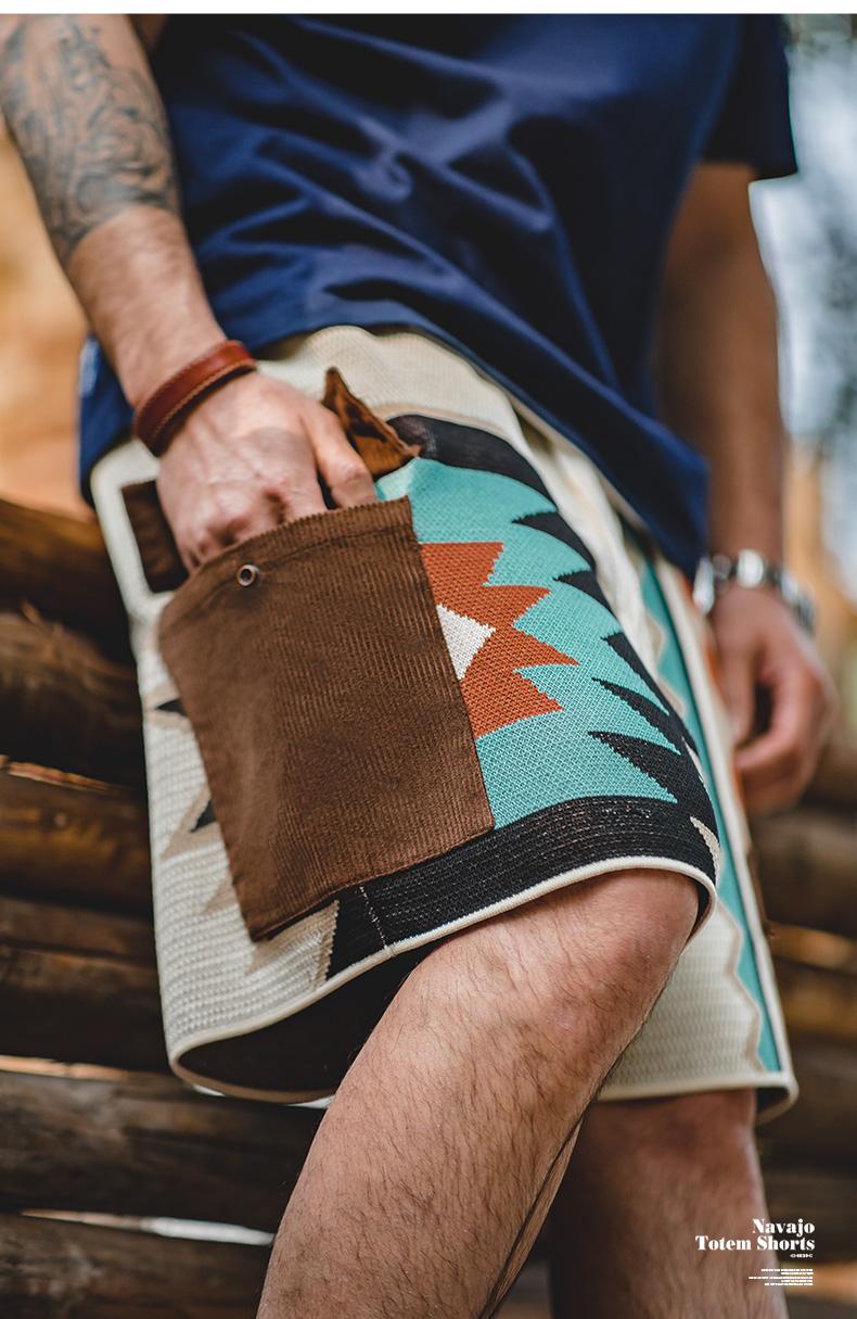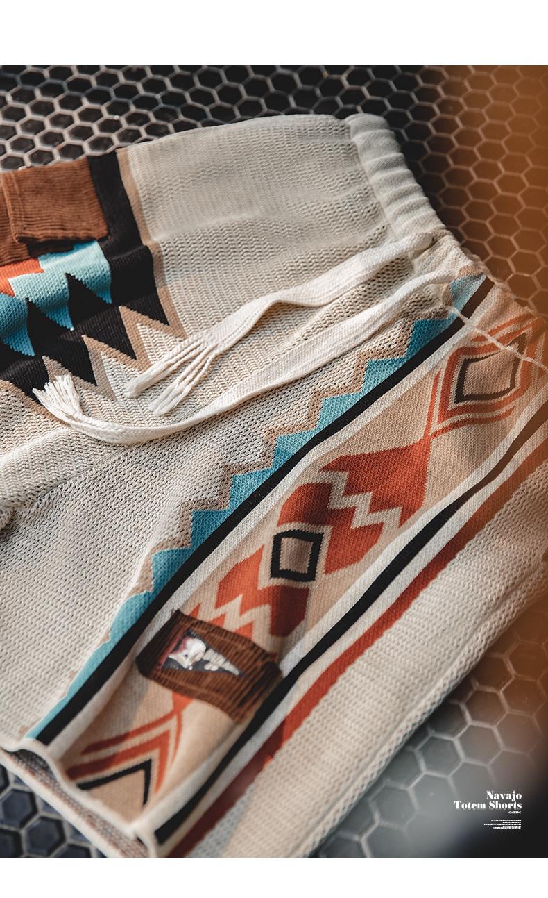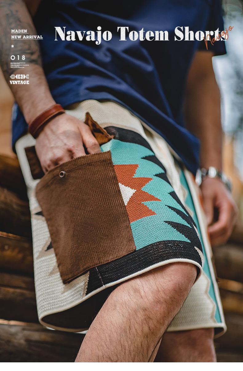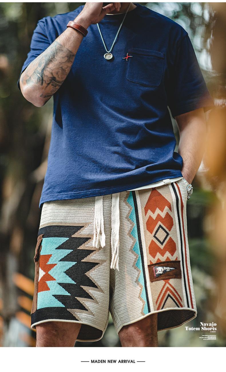 MADEN レトロ ナバホ トーテム 編み込み ショートパンツ メンズ カジュアル 刺繍 幾何学模様 ビーチ用 短パン 紐付き ゴムウエスト ショートパンツ