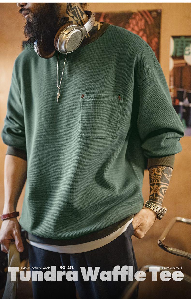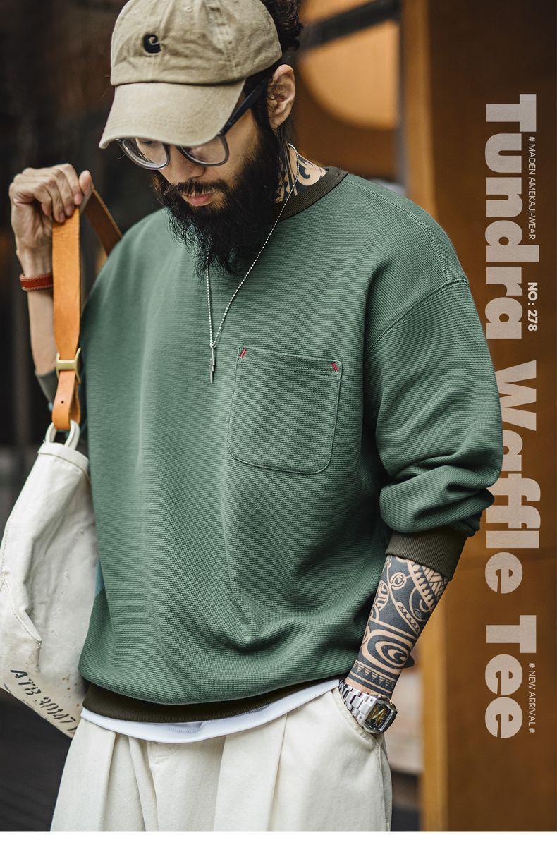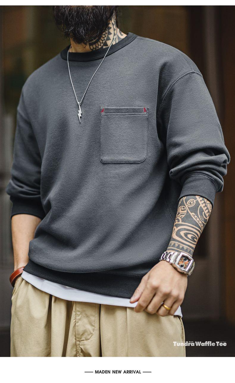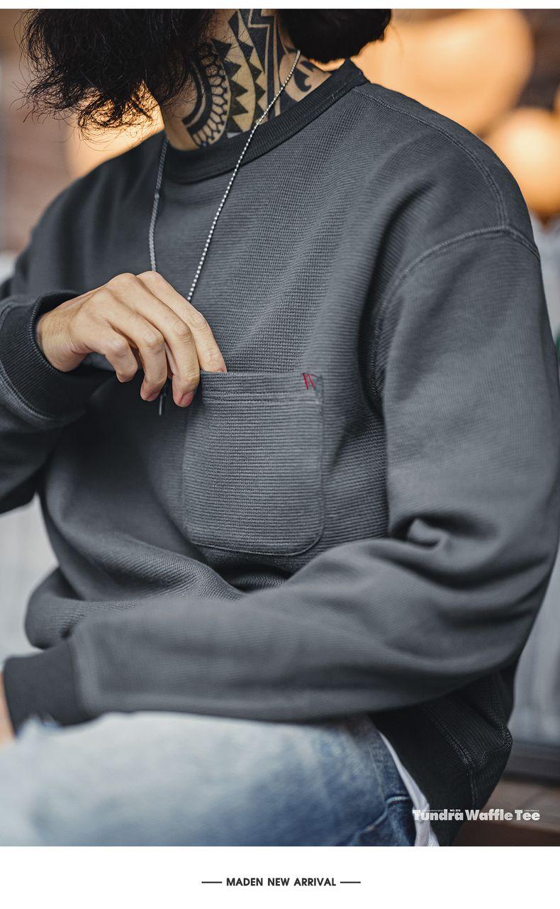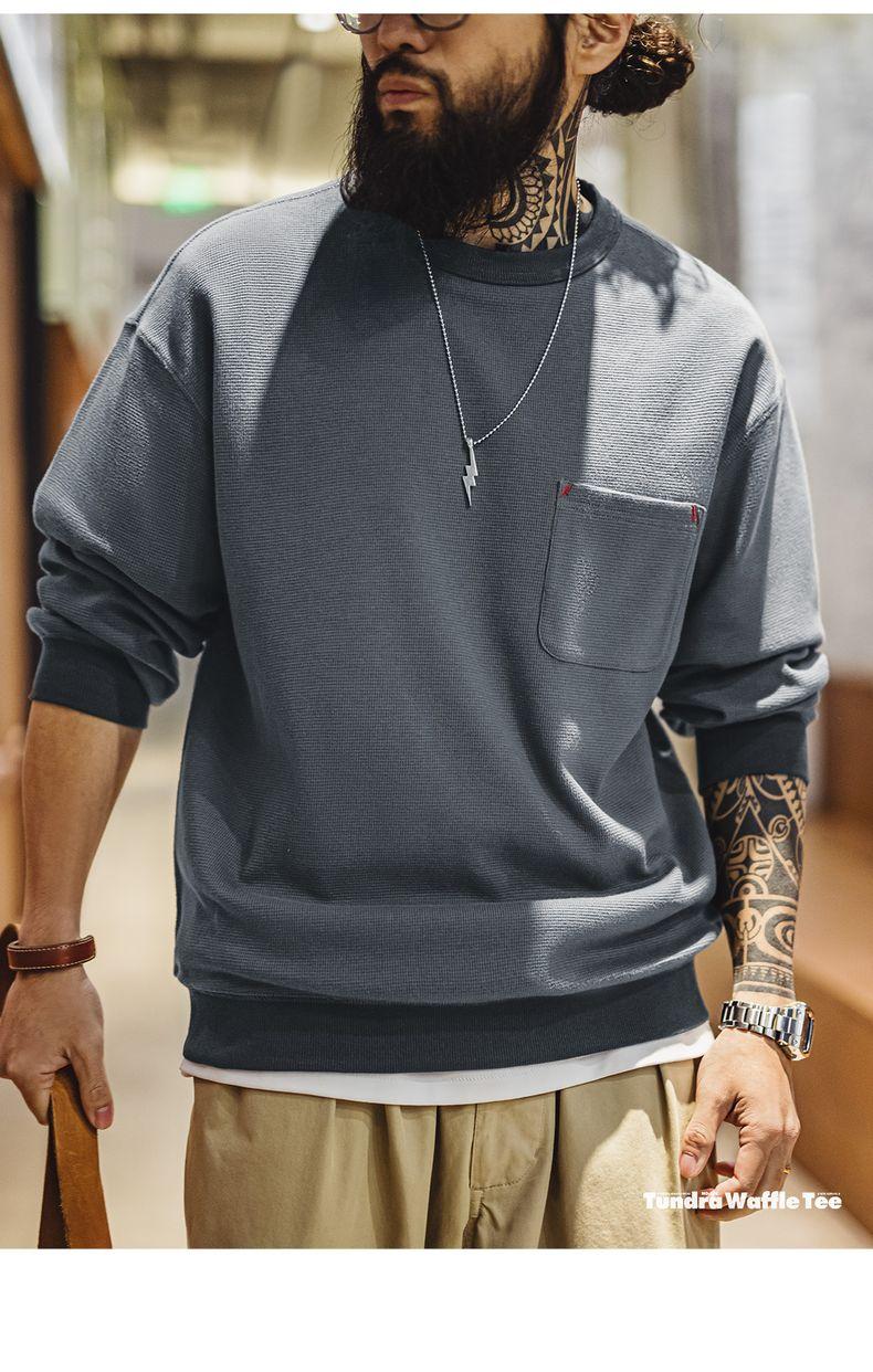 남성용 캐주얼 와플 니트 스웨트셔츠 루즈핏 포켓 티 편안한 핏 긴 소매 풀오버 미국식 캐주얼 스타일