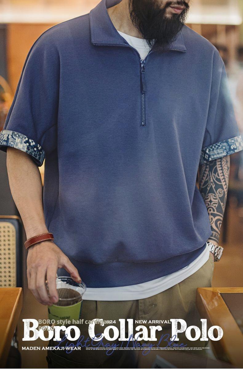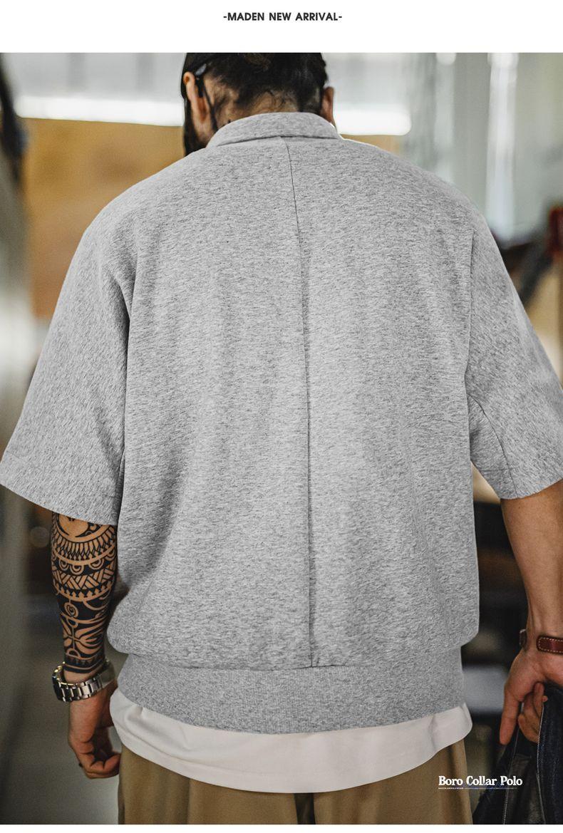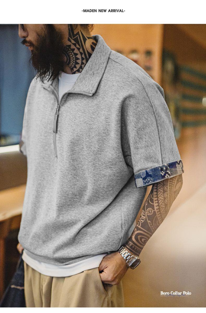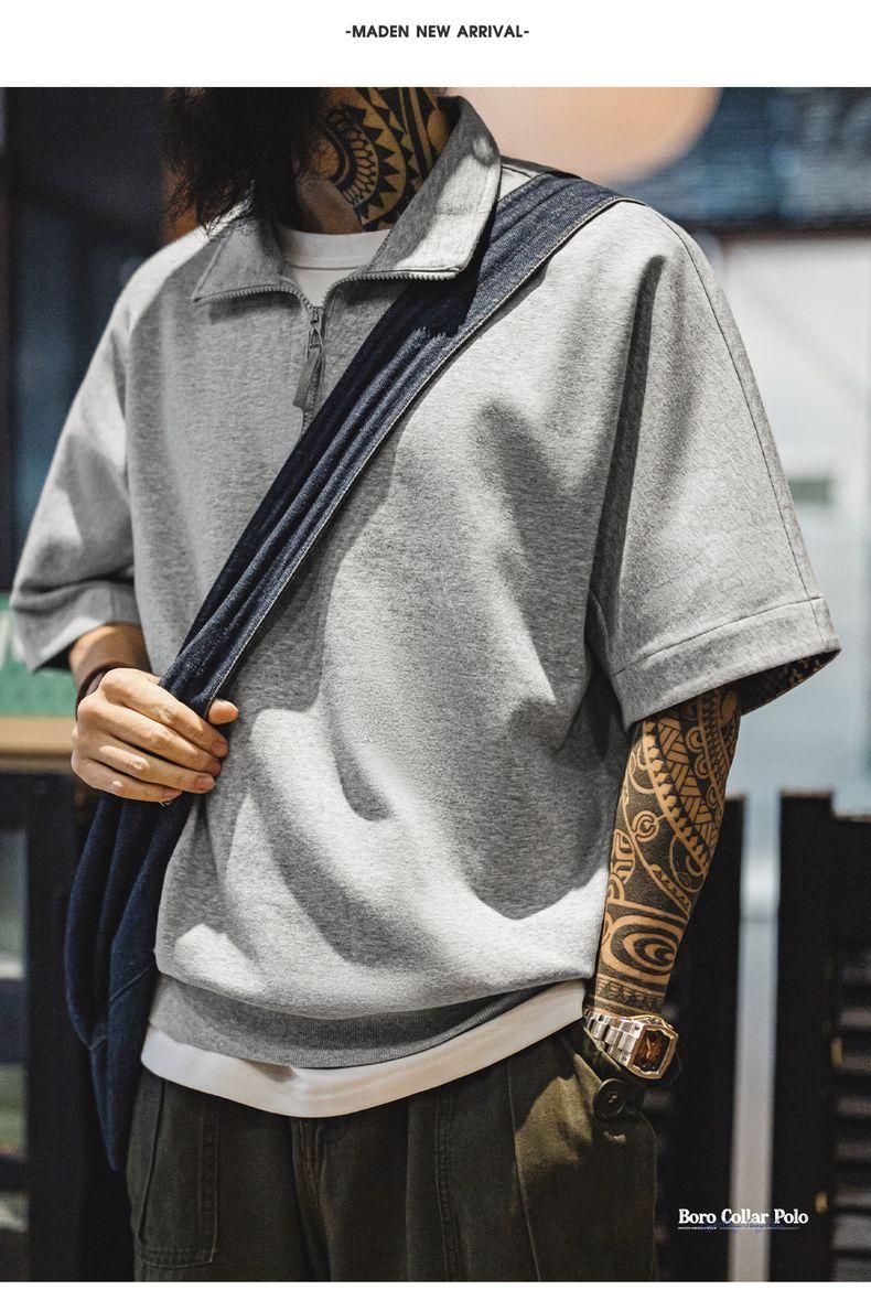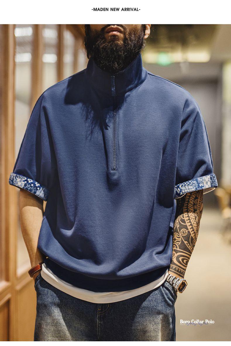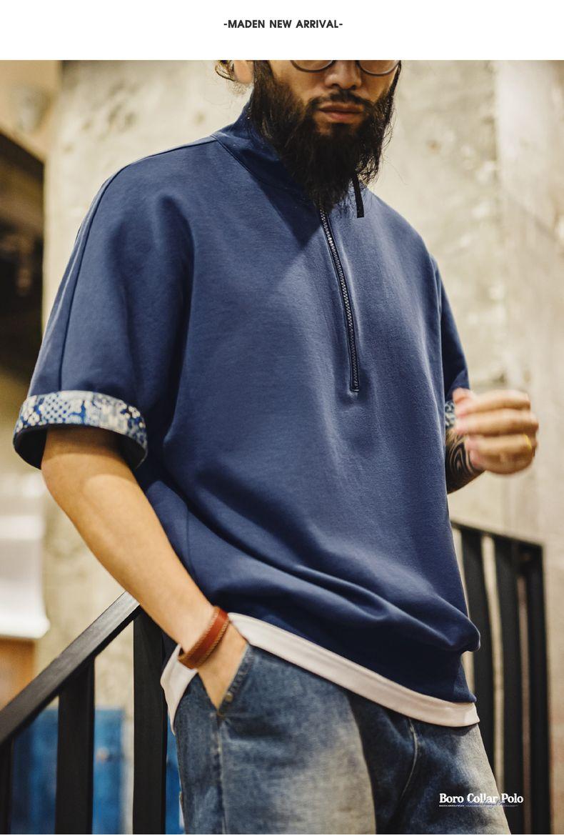 MADEN Workwear American Retro Boro Style Half Placket Polo Vintage Print Loose Casual Collar T-Shirt Men Summer