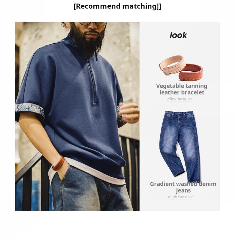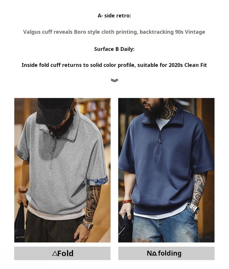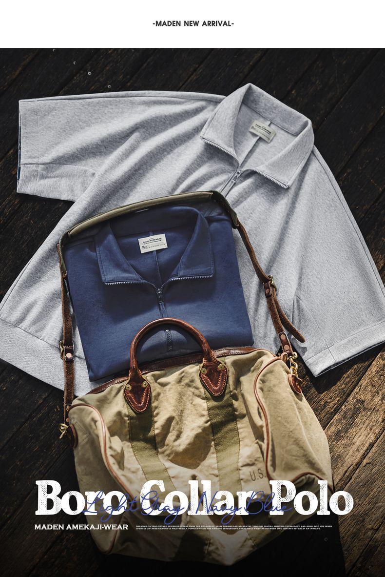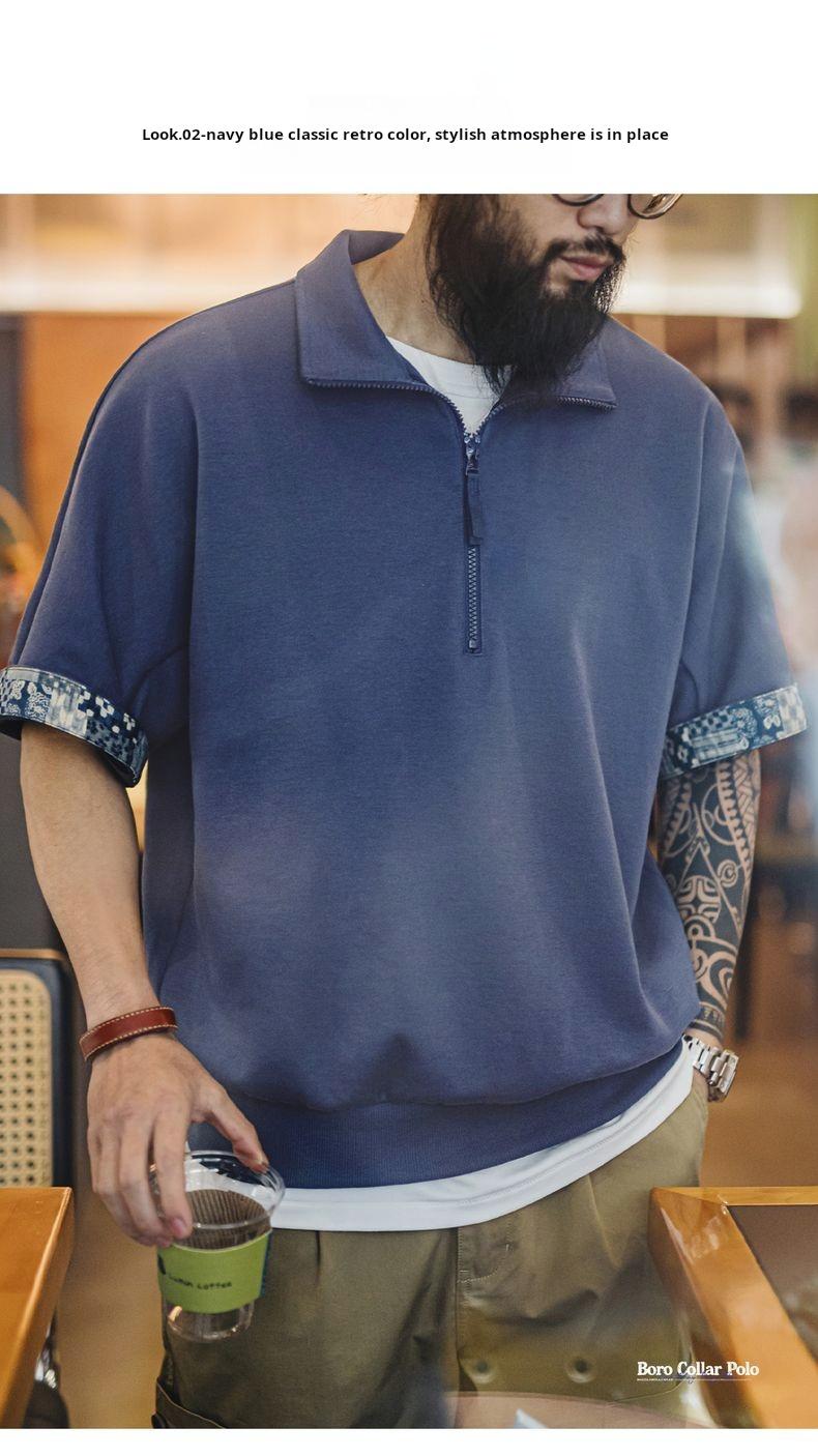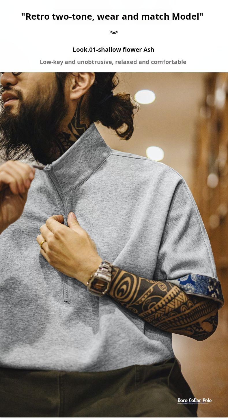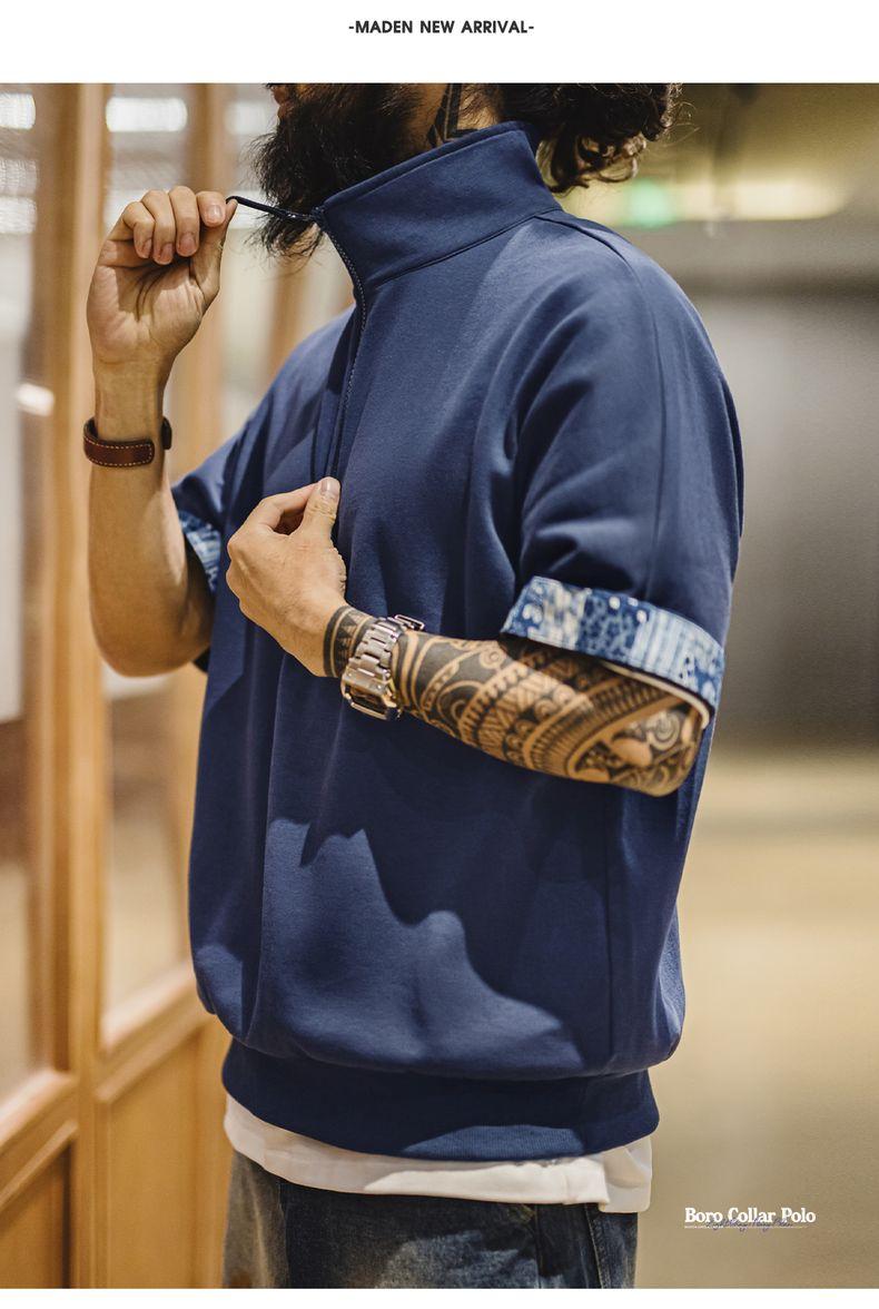 MADEN Workwear American Retro Boro Style Half Placket Polo Vintage Print Loose Casual Collar T-Shirt Men Summer