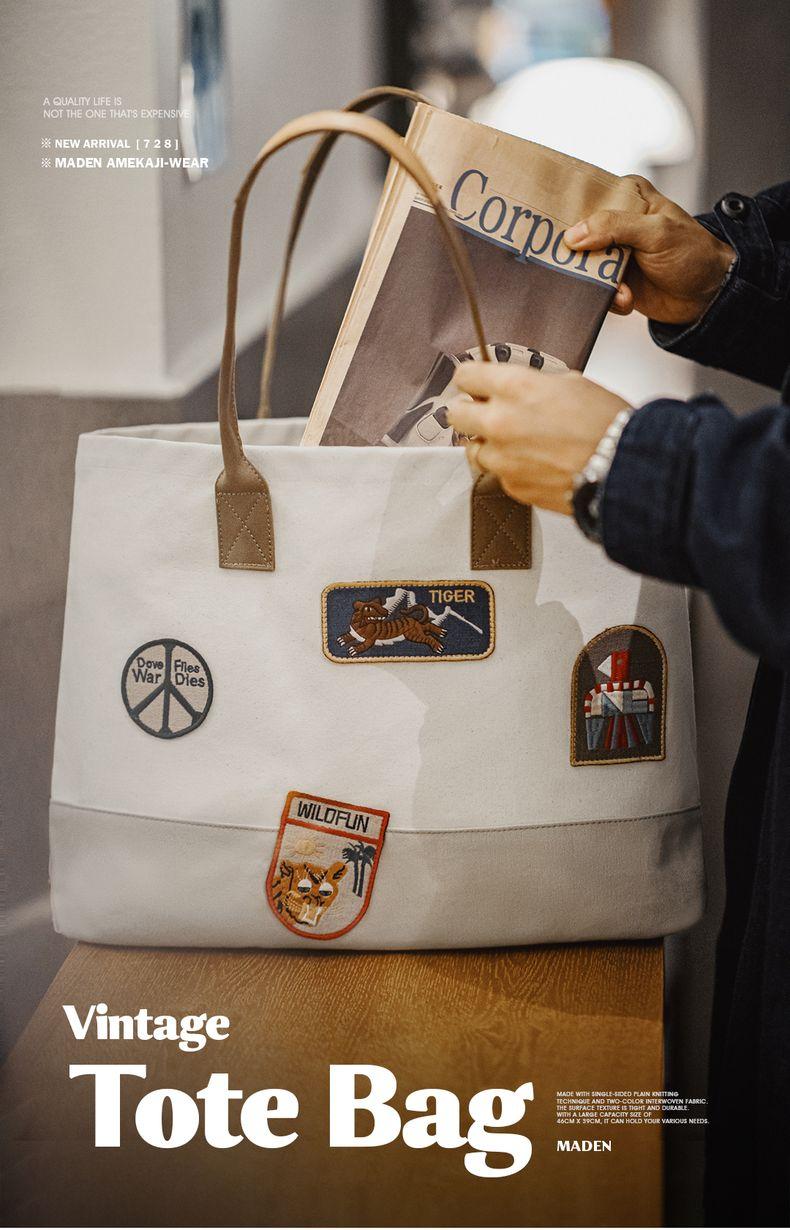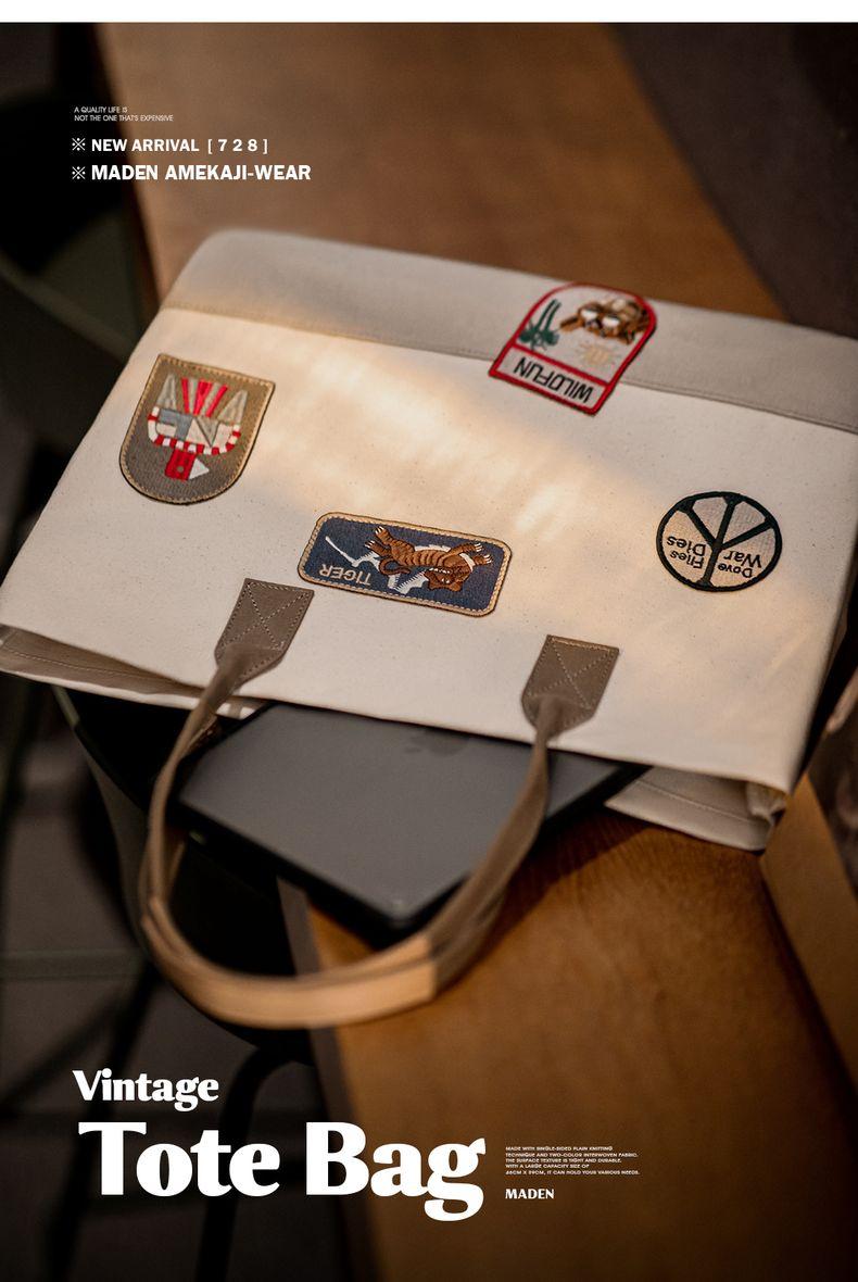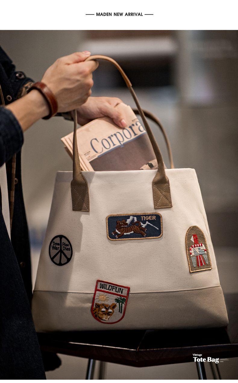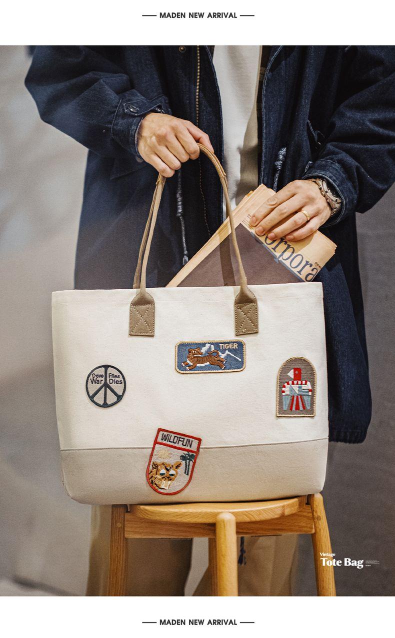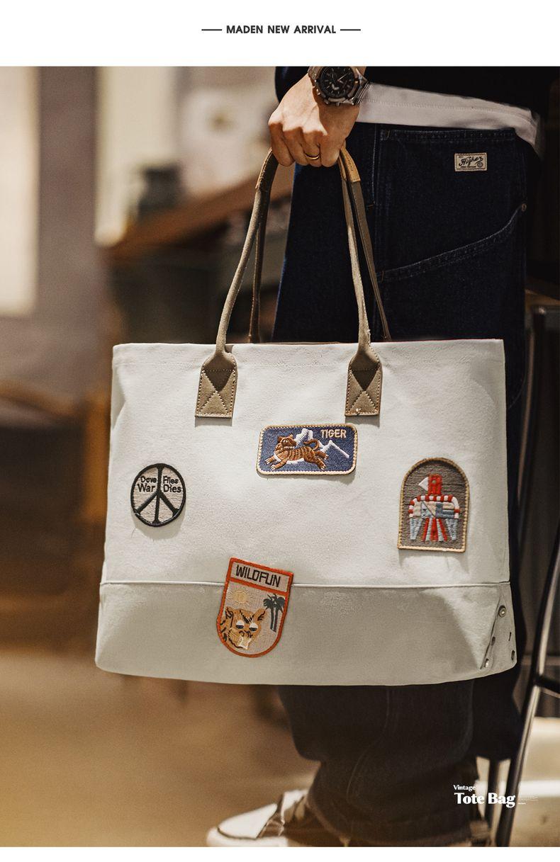MADEN Retro Embroidery Patches Tote Bag Unisex Large Capacity Utility Shoulder Bag Camera & Laptop Carryall Workwear Versatile Bags
