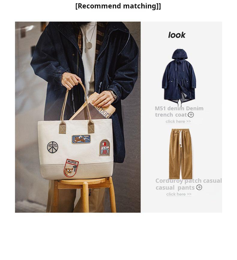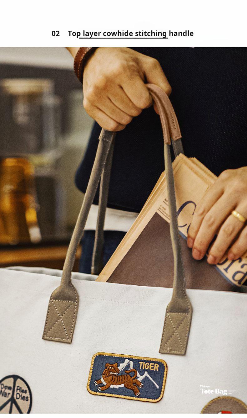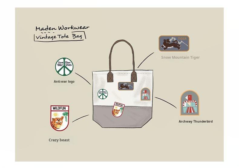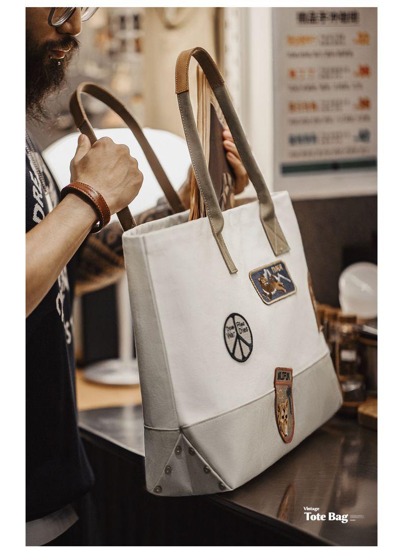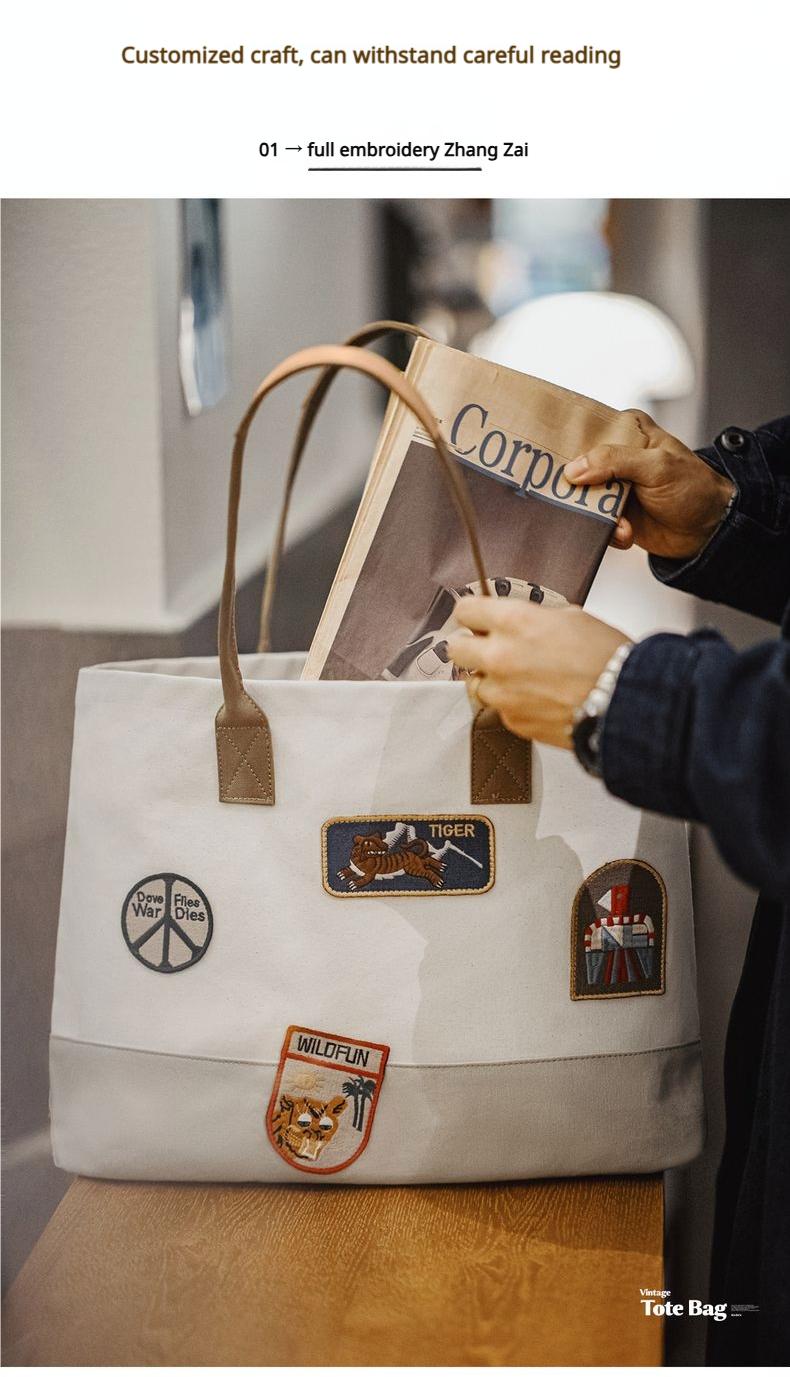 MADEN Retro Embroidery Patches Tote Bag Unisex Large Capacity Utility Shoulder Bag Camera & Laptop Carryall Workwear Versatile Bags