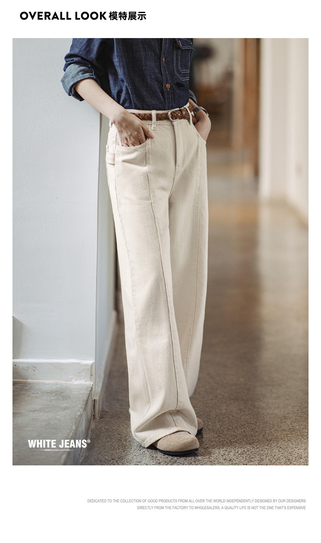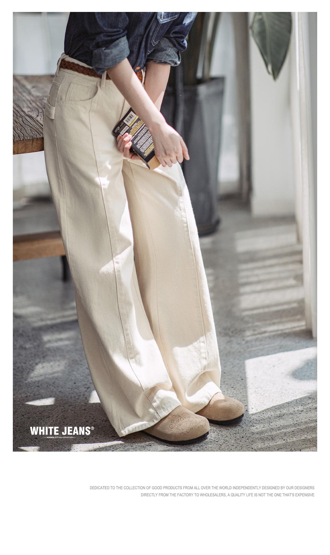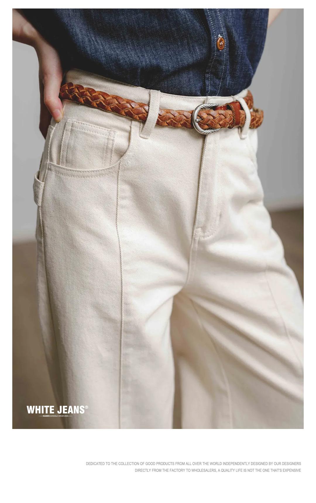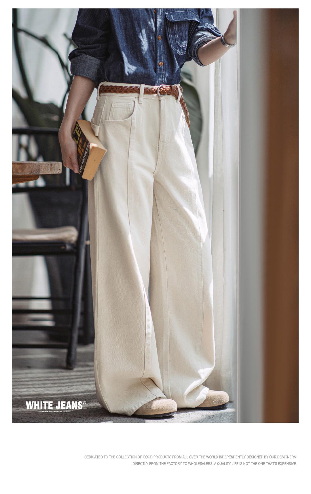 MADEN Retro White Cottonseed Straight Jeans Loose Fit Wide-Leg Casual Pants with Pockets Trousers for Women's Spring And Autumn