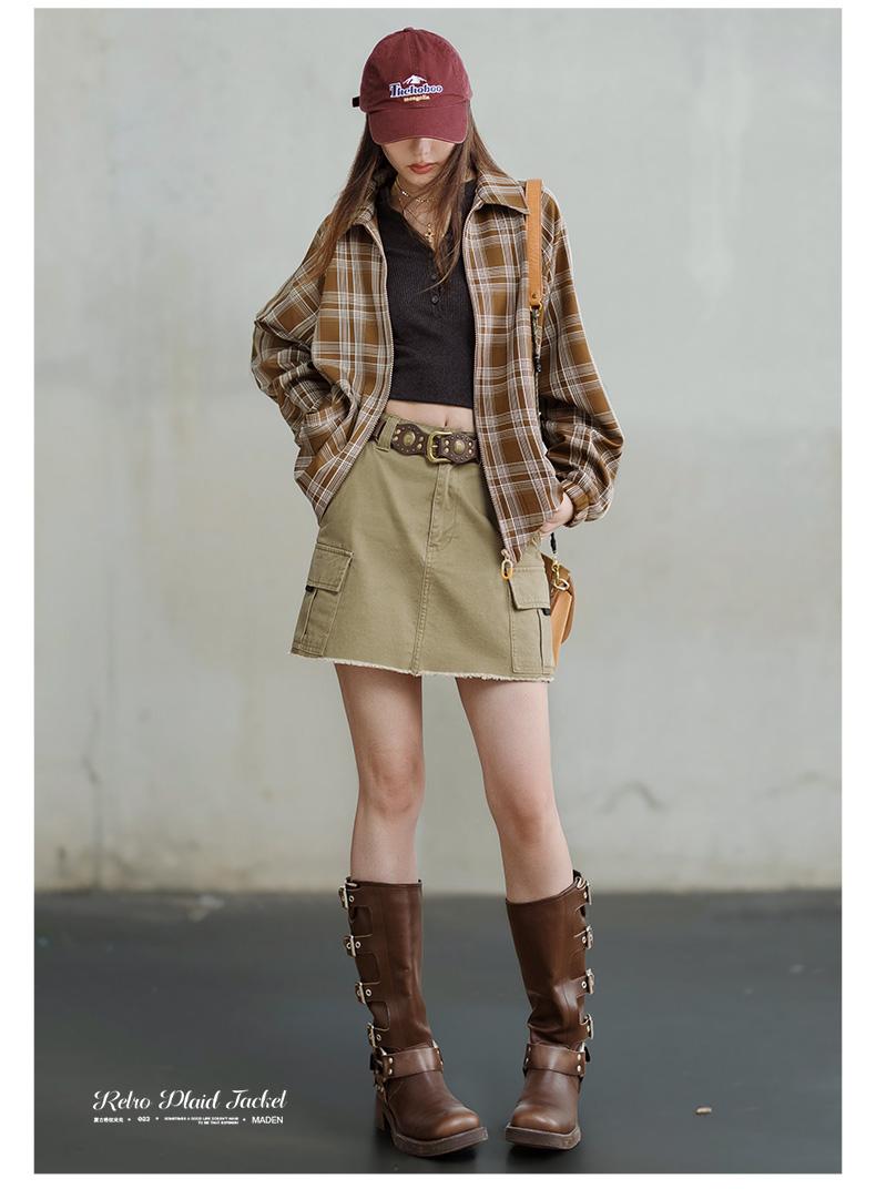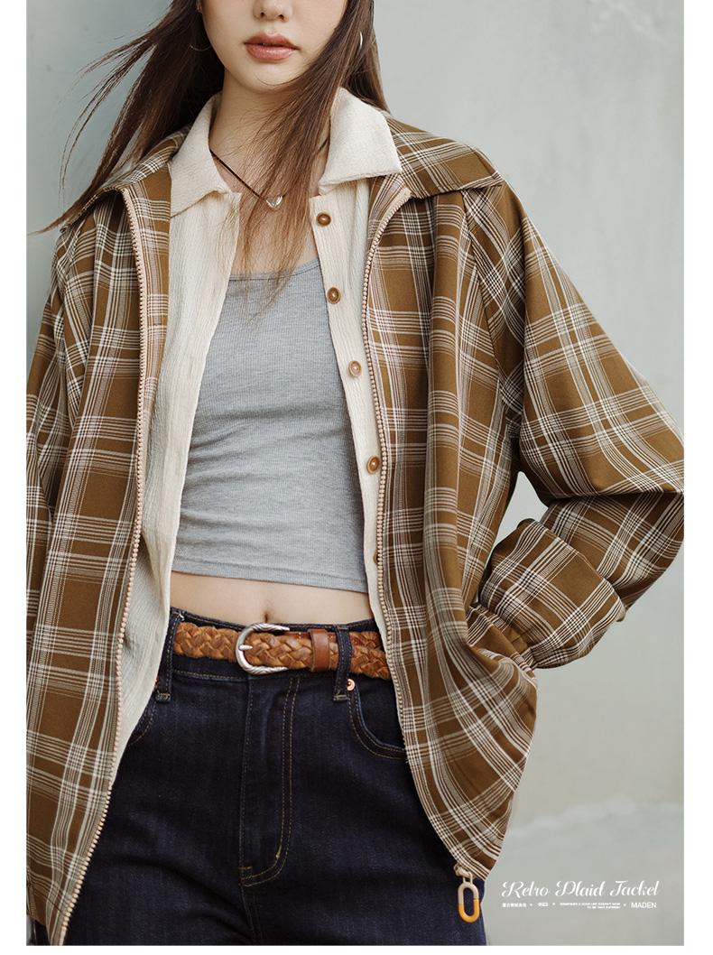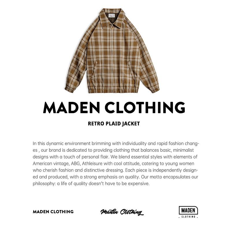 Áo khoác kẻ caro cổ bẻ phong cách cổ điển MADEN cho nữ màu kaki, áo khoác nhẹ mùa xuân và thu, áo rộng rãi thường ngày, áo khoác nữ phong cách thư giãn